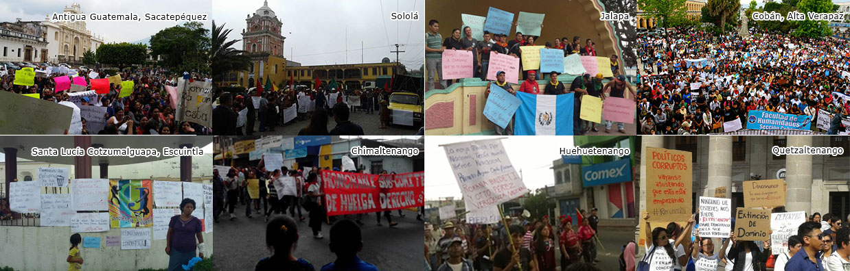 En los departamentos de Guatemala, Quetzaltenango, Huehuetenango, Sacatepéquez, Quiché, Totonicapán, Sololá, Alta Verapaz, Jalapa, Escuintla, Chiquimula, Santa Rosa entre otros sucedieron las manifestaciones que pese a la lluvia no fue obstáculo para que la población se diera cita a cada punto de reunión para expresas su sentir.