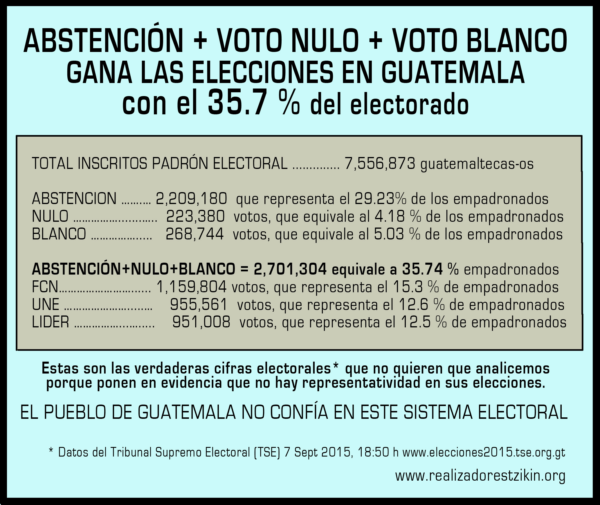 Con justa razón podemos decir entonces que en estas Elecciones 2015 quien ganó fue el Abstencionismo, el Voto Nulo y en Blanco, es decir ganó el “NO ME REPRESENTAN”. Es un mensaje claro de la mayoría de la población guatemalteca que no se siente representada en ningún partido político y además pone en entredicho el sistema electoral y de partidos políticos y el mismo concepto de democracia representativa.