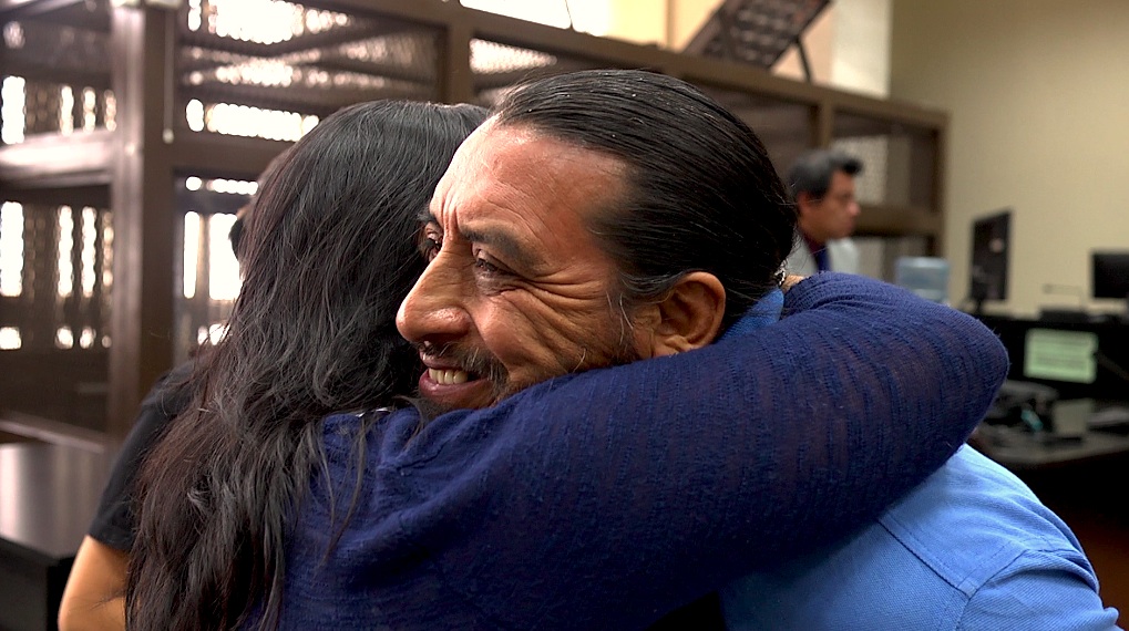 Al finalizar la Audiencia familiares y amigos saludan y animan a Rigoberto Juárez, preso politico desde el 24 de Marzo 2015. Foto: Red Tz'ikin