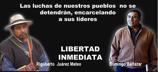 "El día de ayer en horas de la tarde fueron capturados los señores Rigoberto Juárez Mateo y Domingo Baltazar por elementos de la Policía Nacional Civil –PNC-, luego de que ambos interpusieran la denuncia por los hechos de violencia cometidos en contra del liderazgo del Gobierno Plurinacional de la Nación Q´anjob´al, Chuj, Akateka, Poptí y Mestiza.