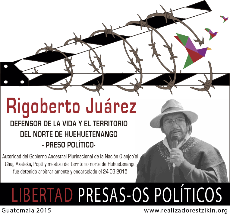 Las palabras de Rigoberto Juárez, preso político del estado oligarca, racista y colonialista guatemalteco, ayudan a clarificar el por qué de esta criminalización contra los defensores de la vida, el agua y el territorio: "Como Coordinador del Gobierno Plurinacional Ancestral Maya Q’anjob’al, Chuj, Akateko, Popti´ y Mestizo, en el territorio Q’anjob’al, voy a asumir la responsabilidad histórica de indicar que lo que hoy se está haciendo es solamente un incidente más de agresión en contra de nuestras naciones ancestrales, que se inició desde hace 491 años."