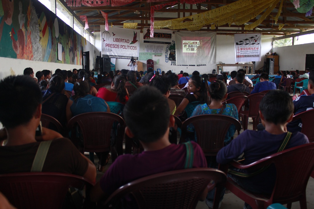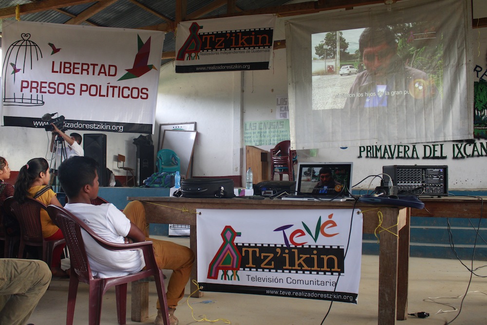 Para finalizar se presentó el primer programa de Tz’ikin TeVé, que a pesar del cansancio acumulado de una jornada calurosa de estudios, ganó simpatía y aplausos entre el joven público asistente. Resultó de mucho interés el segmento micrófono abierto y el de Libertad Presos políticos donde los alumnos-as pudieran ver y escuchar los testimonios de los presos políticos de Barillas: de Saúl Méndez, Rogelio Valásquez, Mynor López y Taño López. Ellos son 4 de los más de 100 presos políticos presos políticos que el estado de Guatemala mantiene privados de libertad por oponerse a la construcción de la hidroeléctrica Hidro Santa Cruz en su territorio.