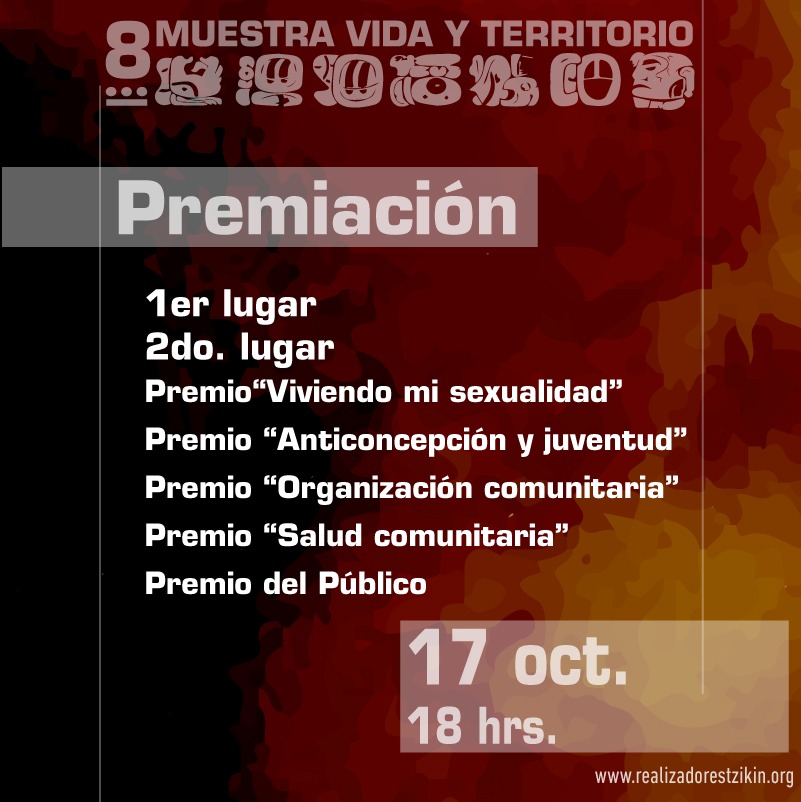 La Premiación Oficial de la 8ª Muestra se realizará hoy sábado 17 de octubre 2020 a partir de las 18 h (hora de Guatemala) y será retransmitida a través del Facebook Live de la Muestra Vida y Territorio: https://www.facebook.com/muestravidayterritorio/live/